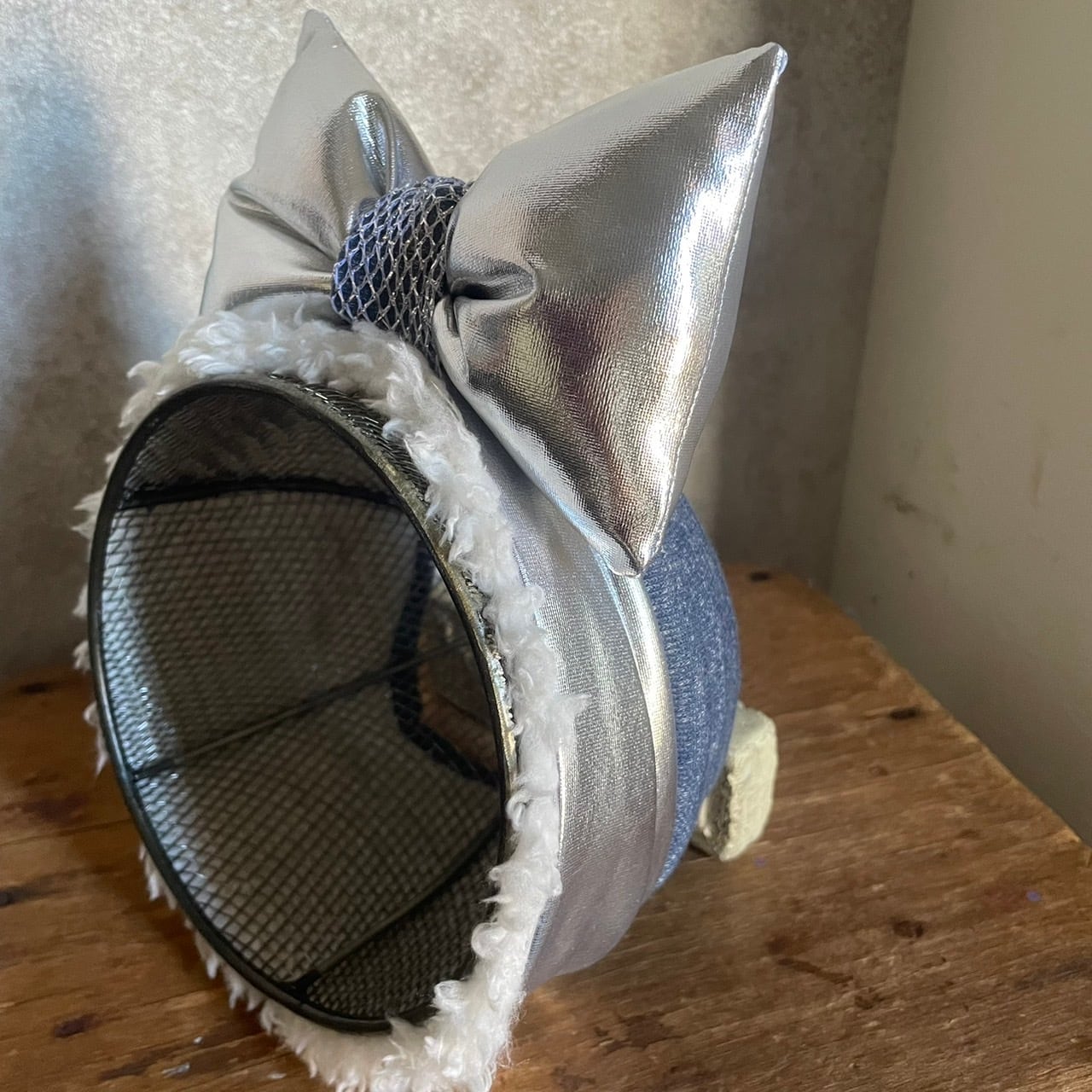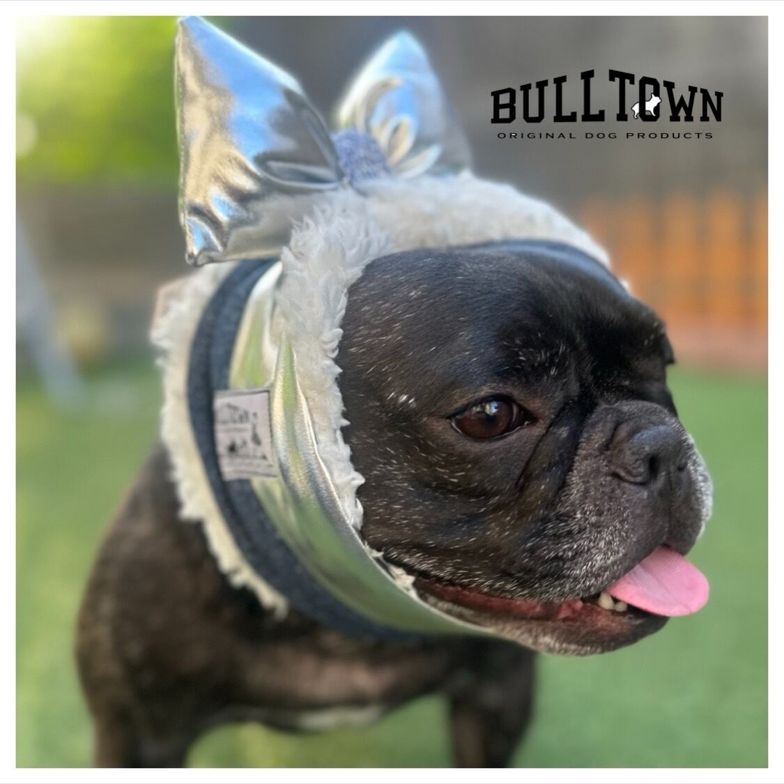 キラキラ輝くメタリックシルバーとBULLTOWNのデニムコラボビックリボンが特徴のウォーマーです。寒い季節に首元を華やかに飾りたい方にオススメです。ネックウォーマーとしてだけでなく、顔周りに付けてもお使いいただけます。一点一点手作りで仕上げられており、デザイン性と品質にもこだわっています。キュートでゴージャスなビックリボンが、ファッションにアクセントを加えます。寒さ対策に加えて、おしゃれを楽しめる一品。あなたのコーディネートを引き立てるアイテムになること間違いなしです。